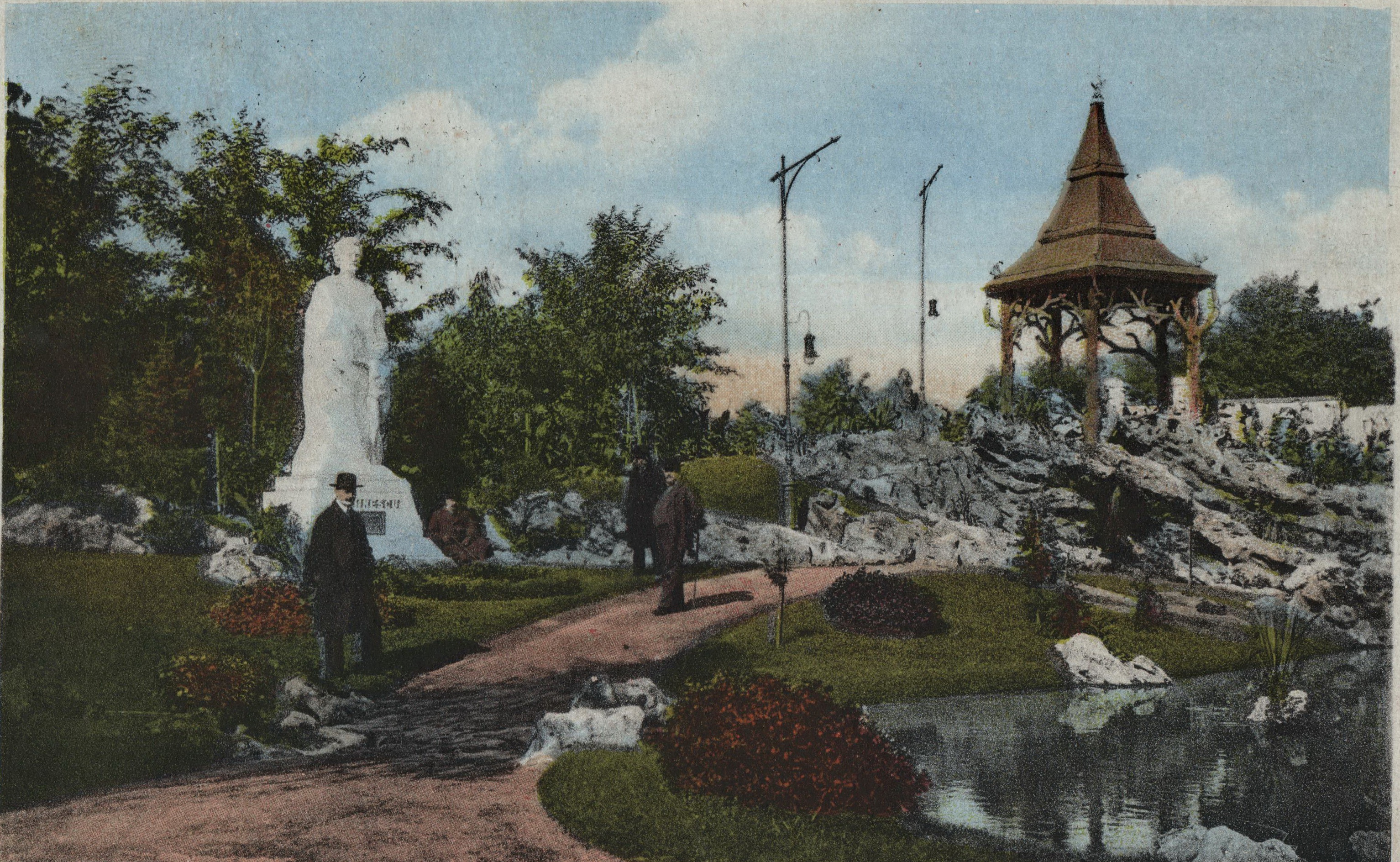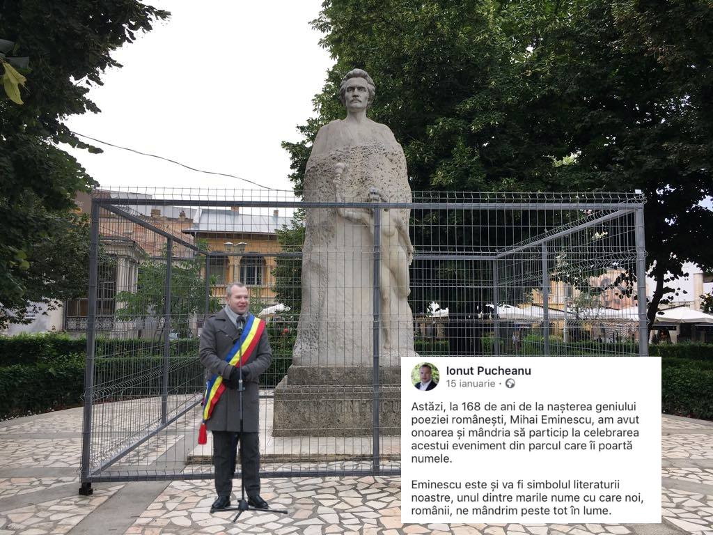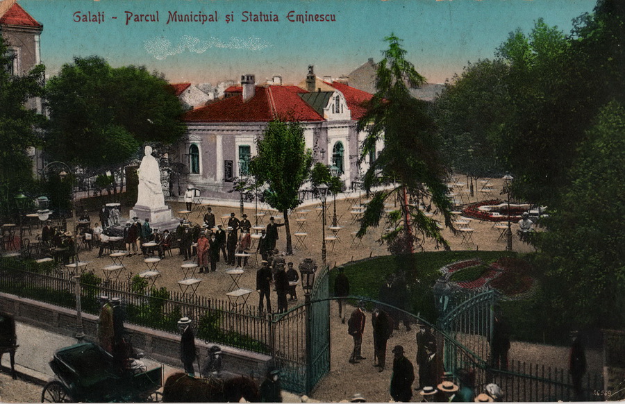 În fotografia de epocă, se vede o statuie a lui Eminescu amplasată în cea mai bună poziție, pe un platou cu deschidere la stradă. Chiar dacă statuia a mai avut încă un amplasament, ceva mai în spate, poziționarea actuală coincide cu cea din proiect, deci în noul Parc statuia monument Eminescu rămâne dosităă în fundul parcului și acoperită de copacii plantați de un imbecil de administrație, supervizat de șefii săi mediocri de la Primărie.