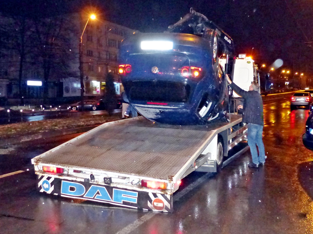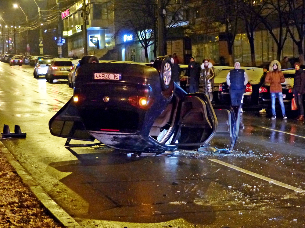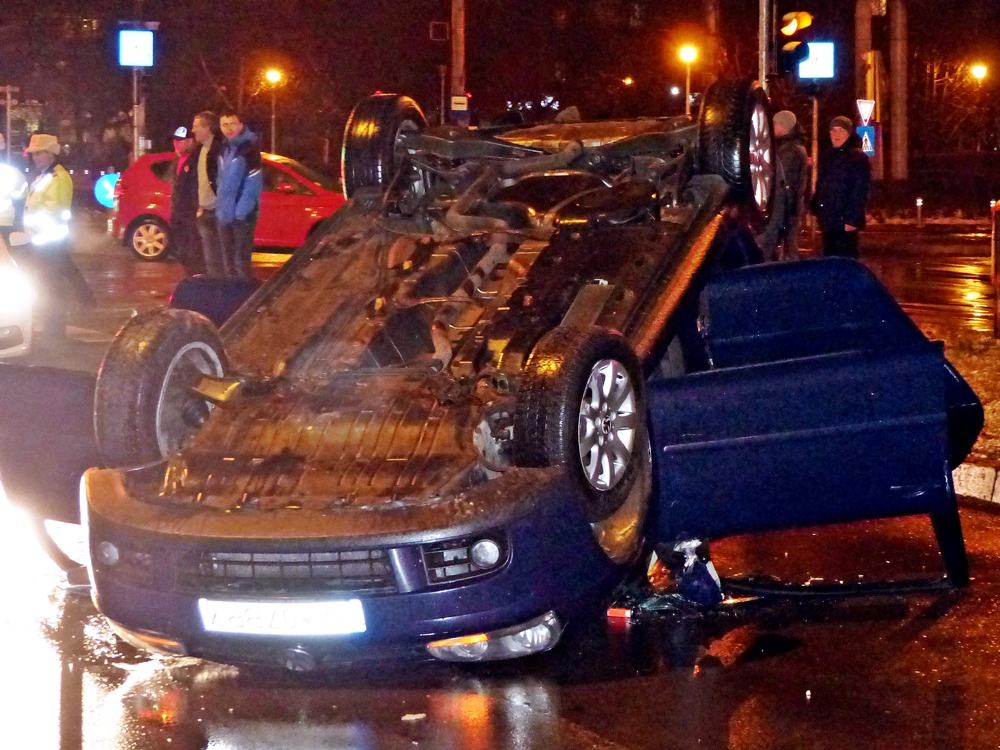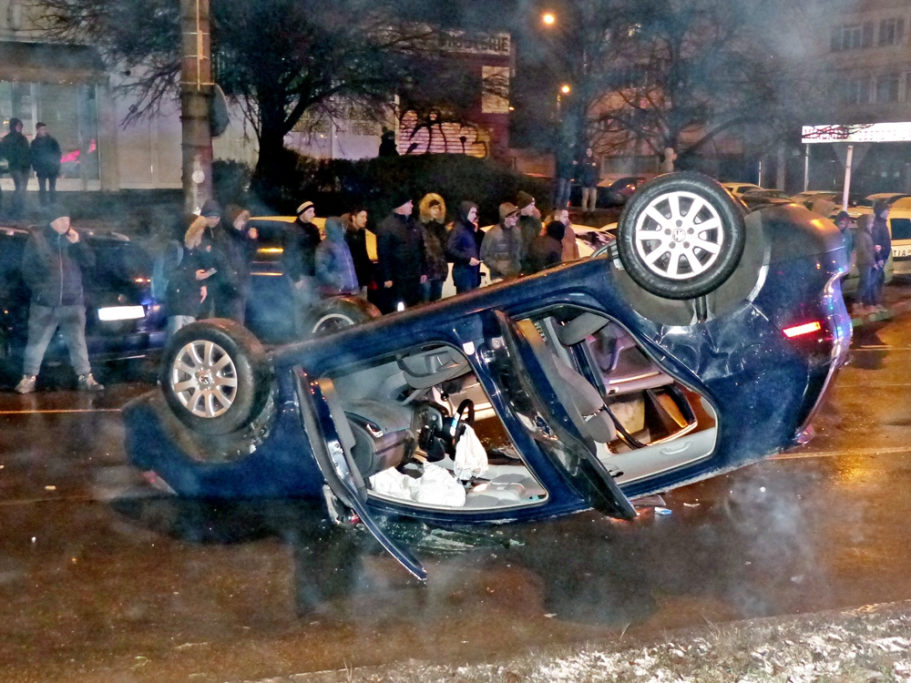 Mașina din imagini a ajuns sâmbătă, 20 ianuarie 2018, pe la ora 20.30, în poziția pe care o vedeți. Aceasta după ce șoferul a depășit mașinile aflate pe banda a treia pe strada Brăilei ori s-a încadrat greșit în banda respectivă, în apropierea intersecției cu strada Roșiori, venind dinspre Stirex. A „agățat” bordura scuarului străzii Brăilei, iar stâlpul semaforului, chit c-a picat la datorie, a definitivat treaba, așezând Golful pe plafon.