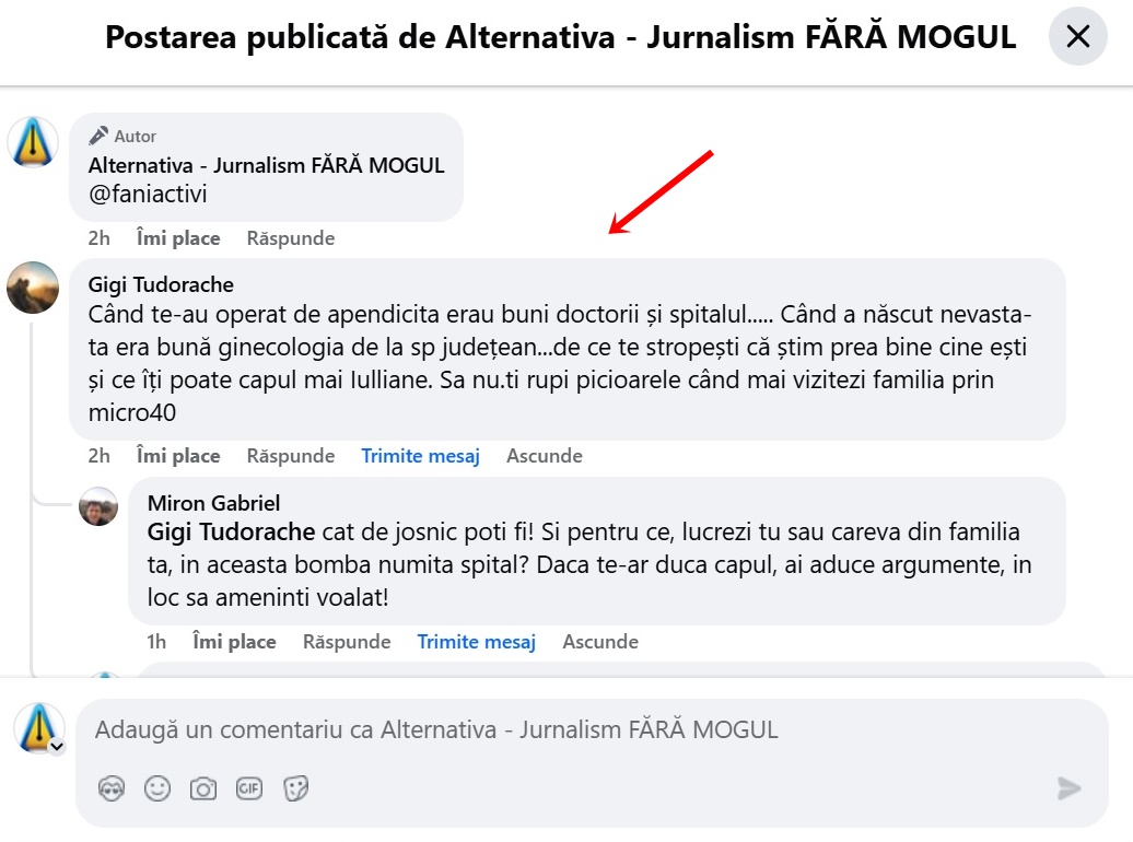 a fost comentariul postat de Gigi Tudorache, pe contul de Facebook al Alternativa – Jurnalism fără mogul, la un articol în care criticam lucrurile care nu sunt în regulă la Spitalul Județean din Galați – vezi foto mai jos.