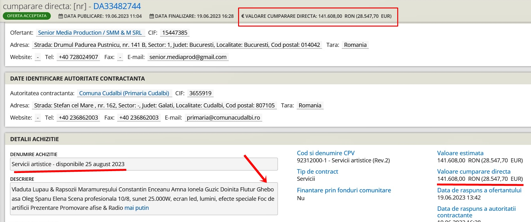 Contractul de 141.608 lei, bani publici, a fost atribuit prin încredințare directă firmei Senior Media Production/SMM&M SRL din București, în data de 19 iunie 2023.