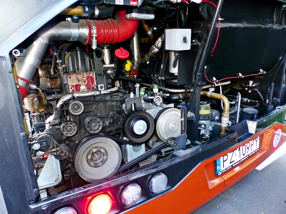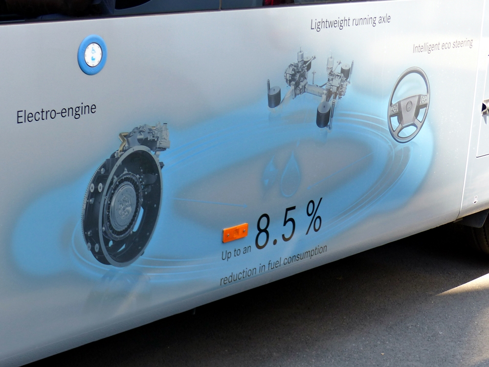 Păi, să vedem: la Mercedesul Citaro prezentat și în imagini, se vede clar că economia de combustibil este PÂNĂ LA 8,5%. Iar la Solarisul Urbid, cu toate că motorul Diesel este doar în 4 cilindri și are doar 4.500 cmc – antrenând un generator electric care la rândul său alimentează un motor electric – tot consumă 30 de litri de motorină/100 km după declarațiile inginerilor care au făcut prezentarea.