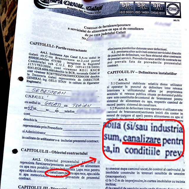 Sau cum dovedește însuși contractul pe care cei de la Apă Canal l-au semnat pentru adresa Traian nr. 49, în care sunt prevăzute foarte clar inclusiv servicii de canalizare.