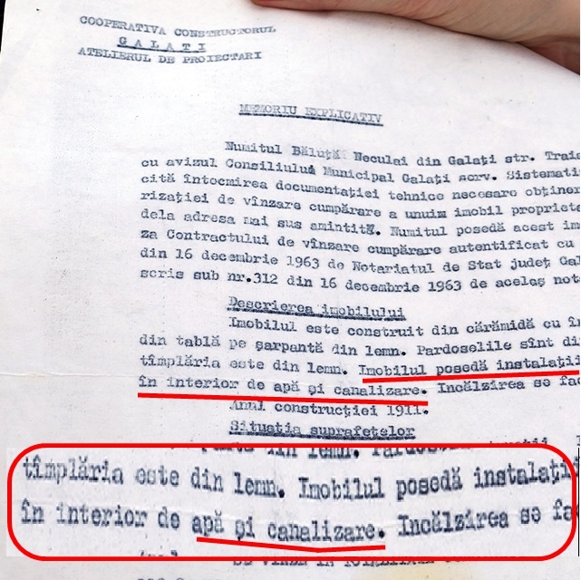 Dar familia proprietară are și acte care atestă că imobilul, datând din 1911 și achiziționat de ei prin anii ’80, este prevăzut de mult cu toate utilitățile, inclusiv apă potabilă și canalizare. Așa cum rezultă și din acest memoriu explicativ ce însoțea obligatoriu orice act de vânzare cumpărare în acea perioadă.