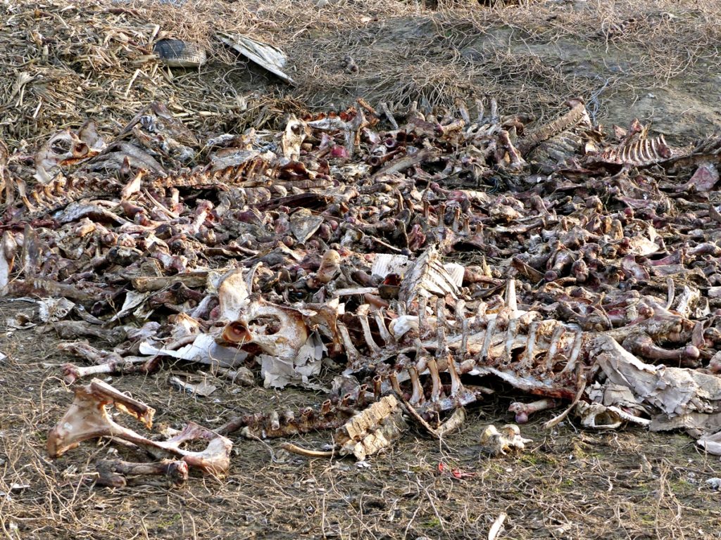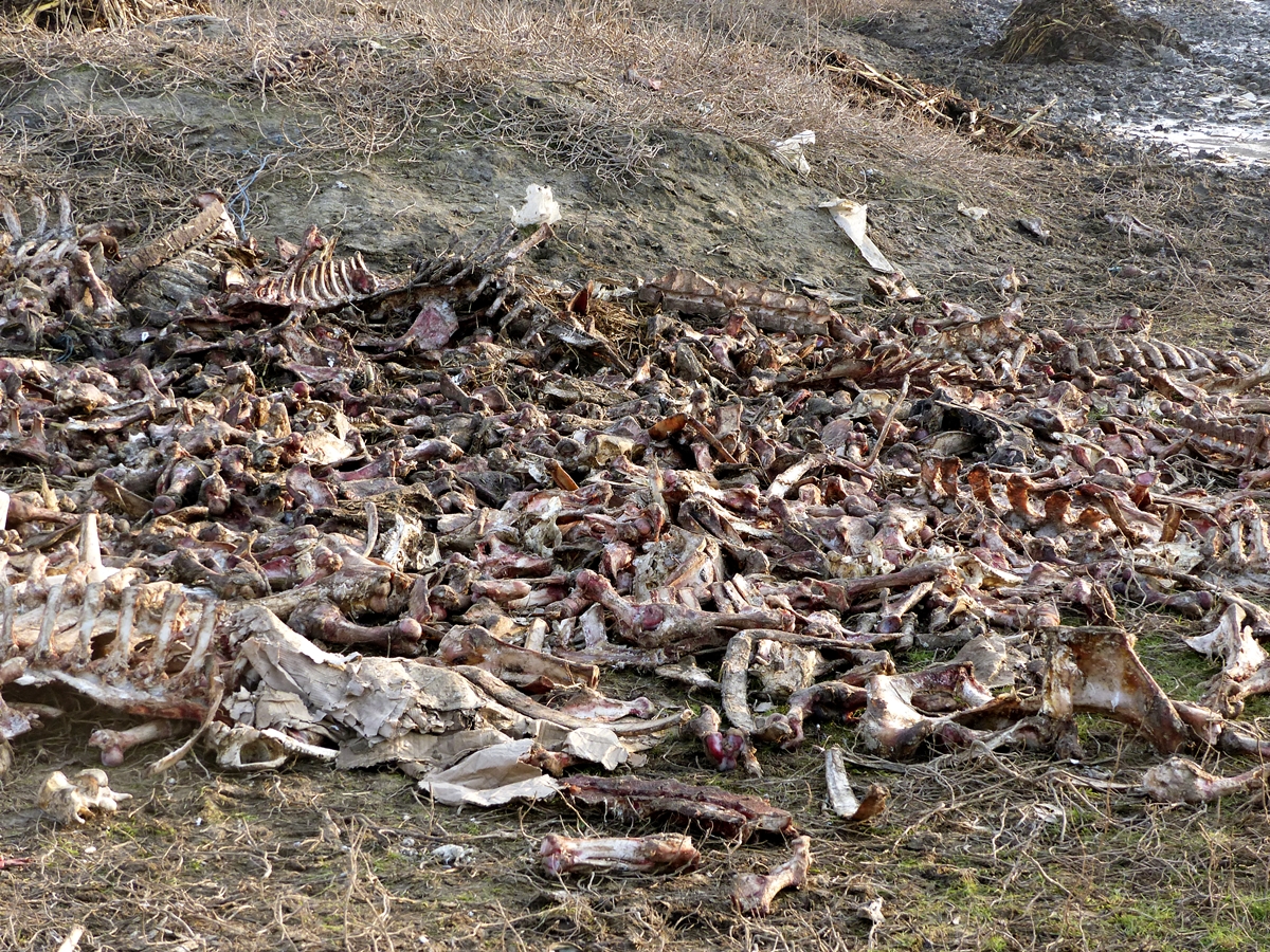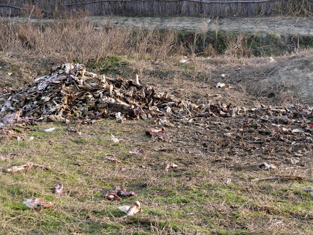 Acum, resturile constând din oase și bucăți nefolositoare rămase de la tranșarea animalelor sunt azvârlite în loc deschis, chiar sub nasul Primăriei am putea spune. Mai exact, pe centura est a Galațiului, chiar vizavi de parcarea de tiruri, imediat după calea ferată. Ciorile semnalizează de la distanță prezența celor câteva movile de resturi animale, printr-un stol gros și negru, rotit continuu deasupra maidanului cu pricina.