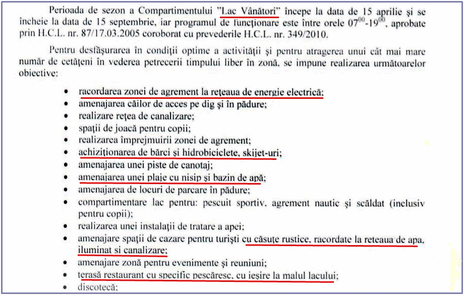 Potrivit unui raport întocmit în luna ianuarie 2019 de cei 7 membri ai Consiliul de Administrație (CA) al SC Gospodărire Urbană SRL Galați (societatea de interes public care are în administrare Lacul Vânători), în acest loc de agrement ar fi trebuit făcute următoarele lucrări de modernizare (vezi facsimil mai jos):