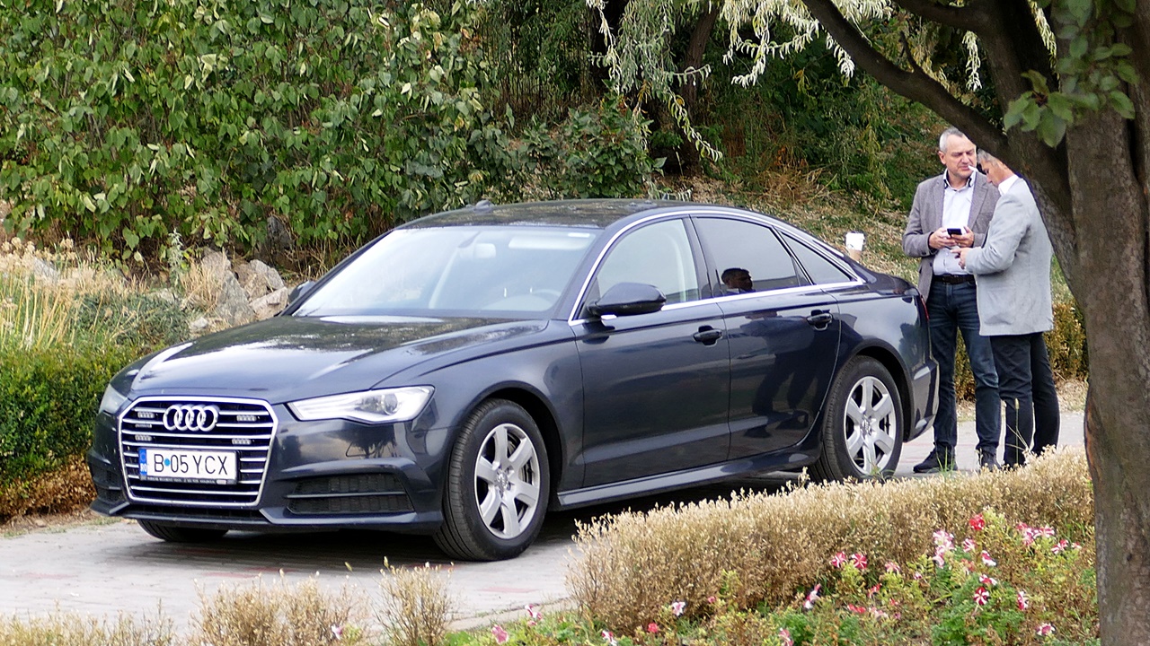 Un Audi A6 3.0 TFSI, penultima generație, de 333 CP cu tracțiune integrală, ca antemergător (vedeți lămpile stroboscopice albastre din grilă).