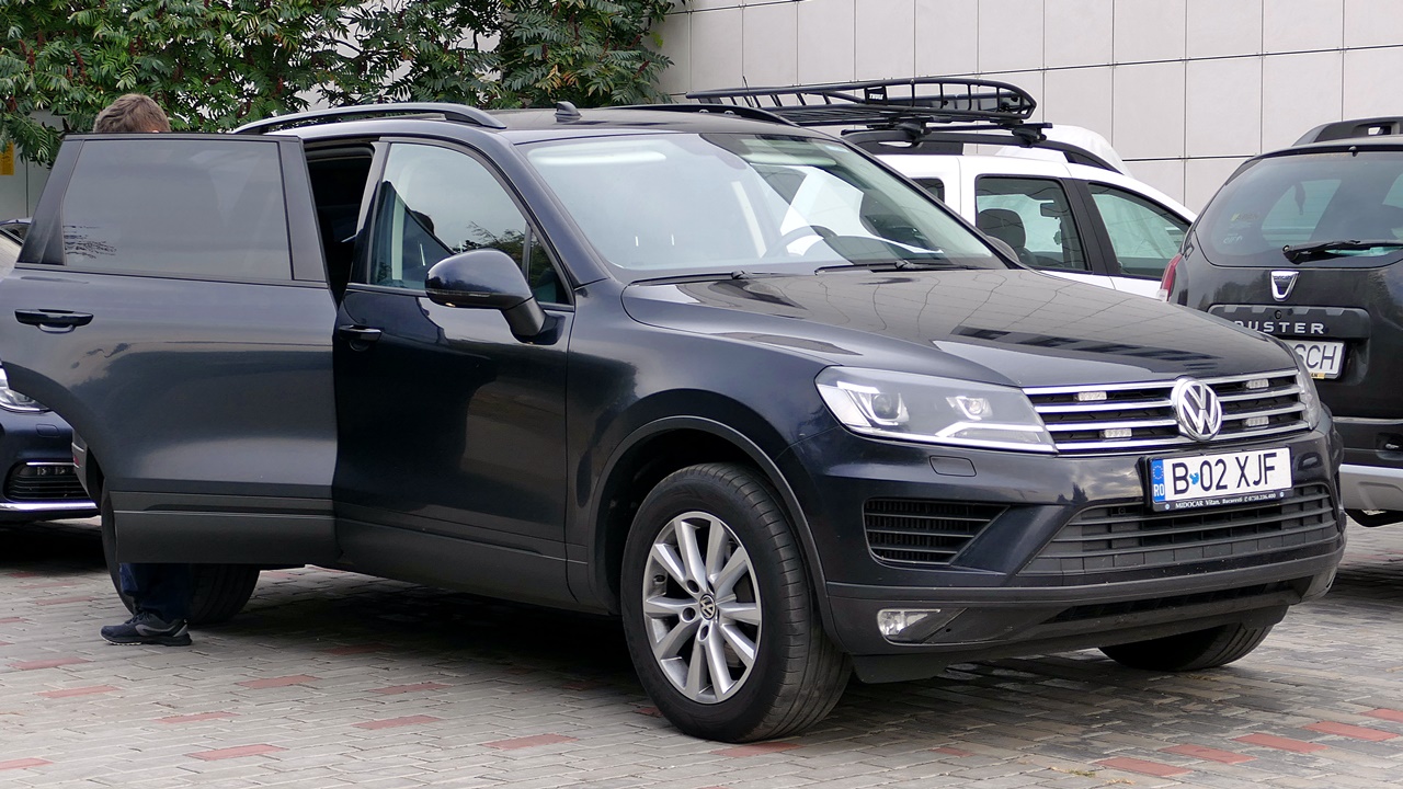 Un Volkswagen Touareg V6 3.0 TDI, penultima generație, de asemenea cu tracțiune integrală, de 262 CP, tot ca antemergător, cu sepepiști, vedeți și la aceasta lămpile stroboscopice albastre din grilă.