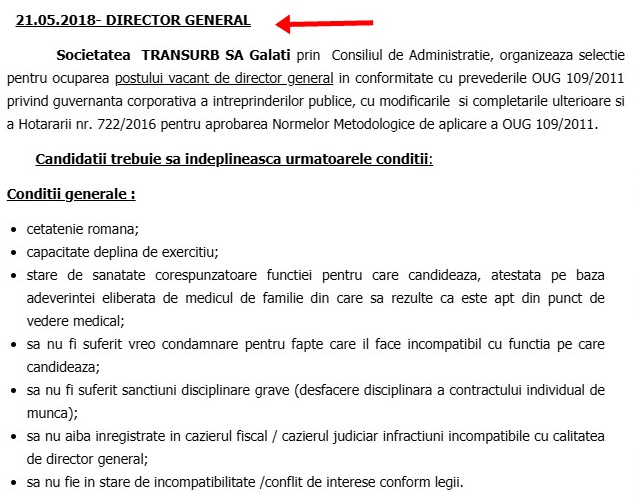 Așa s-a întâmplat în data de 21 mai 2018, atunci când postul de director general al Transurb Galați a fost scos la concurs (vezi facsimil mai jos), ocazie cu care s-au publicat și pașii pentru desemnarea câștigătorului.