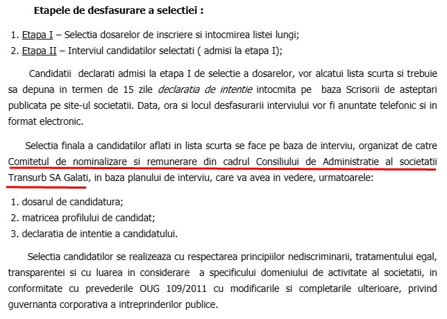 Nu va fi nicio surpriză pentru că selecția candidaților va fi făcută de Comitetul de nominalizare și remunerare din cadrul Consiliului de Administrație (CA) al societății Transurb SA Galați, după cum am specificat mai sus.