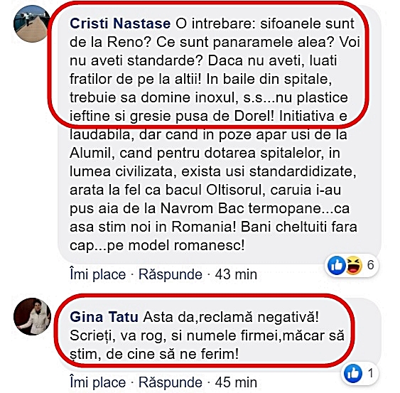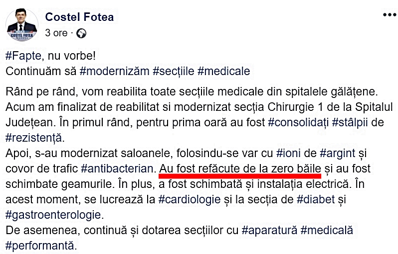 Sperăm, prin demersul nostru, să facem o minimă dreptate celor care, prin taxele și impozitele lor, asigură bunăstarea unor politruci ca Fotea și, implicit, a unor patroni de Dorei mufați la banul public și capabili de ce se vede în imaginea cu baia din Spitalul Județean.