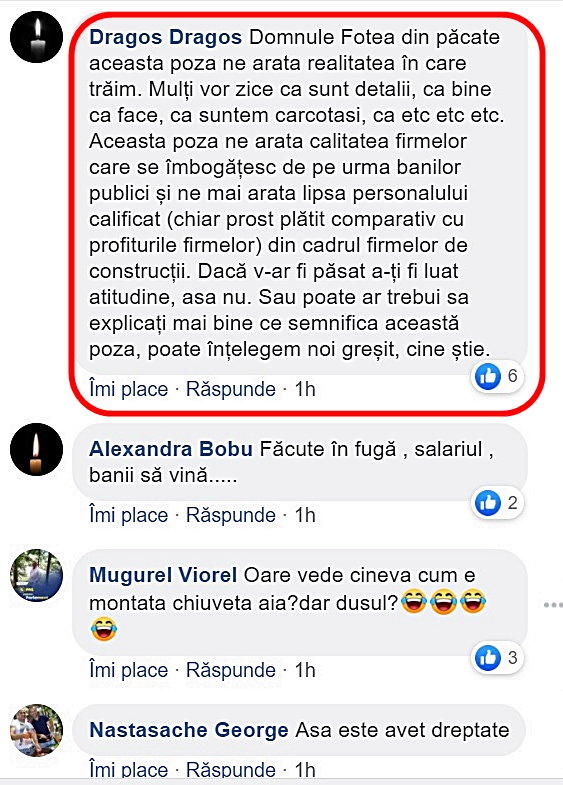 Cum celelalte postări ale președintelui CJ Galați Costel Fotea adună zeci de comentarii laudativ-admirative, criticile la adresa unei „modernizări” de toată jena au dus la iritarea administratorului paginii – sau poate chiar a lui Fotea însuși – până la nivelul lașității.
