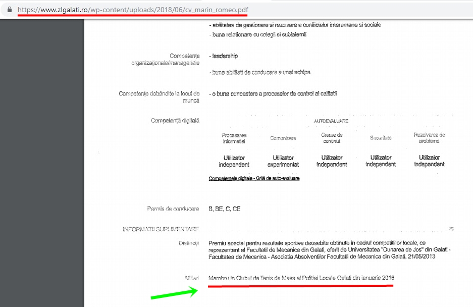 Astfel, Romeo Marin a trecut în CV-ul său că este “membru în clubul de tenis de masă al Poliției Locale Galați”. Și asta nu de ieri, de azi ci “din ianuarie 2016”.