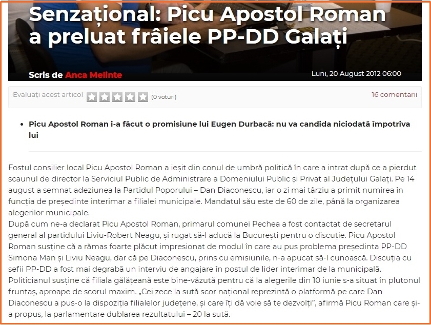 Acum, Picu Roman a fost adoptat de PSD și de primarul Pucheanu cu acte în regulă. Pucheanu se rușinează cu această asociere, că el se dă băiat școlit la Drept, nu ca rudimentarul Picu Roman care a scris niște nuvele jenante despre Bădălanul lui natal pe care le-a prezentat public la TV Galați.