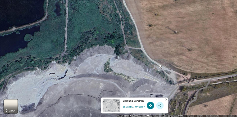 Văzut din satelit, depozitul arată ce ascund gardurile: munți de zgură/lidonit/steril pregătit să intre în fluxul de producție – nu se știe dacă la drumuri sau la fabricația de betoane cu material steril radioactiv.