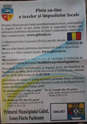 Pe geamuri și la ușă nu era afișat nici măcar un exemplar din afișul tipărit (în câte exemplare, domn Primar?) cu informarea despre plățile on-line. Abia de pe masa directorilor de la Fiscalitate a putut fi extras (cu greu) exemplarul anexat.