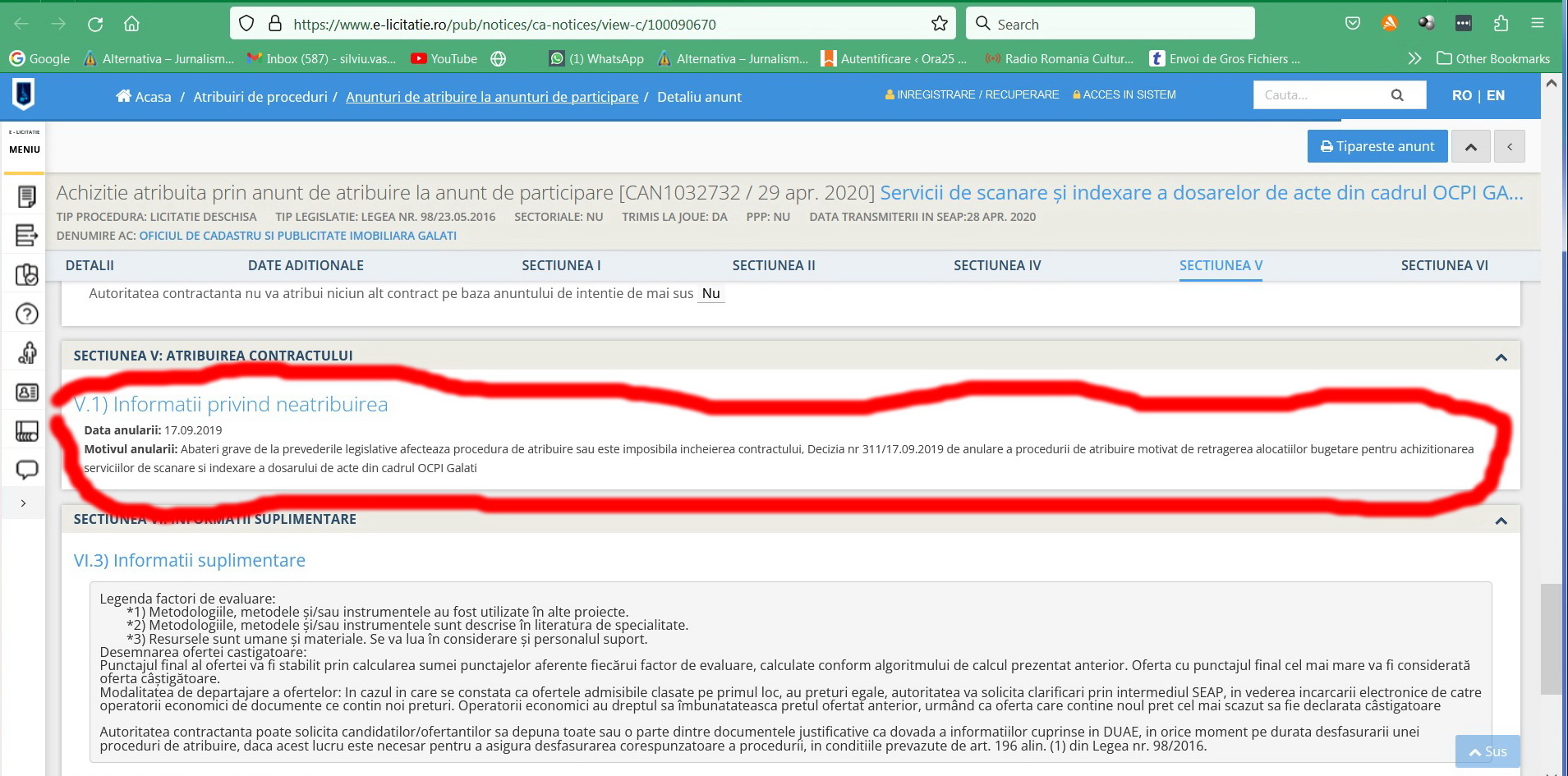 Contractul în cauză (Servicii de scanare și indexare a dosarelor de acte din cadrul OCPI Galați) avea o valoare estimată de 1.260.504 lei.