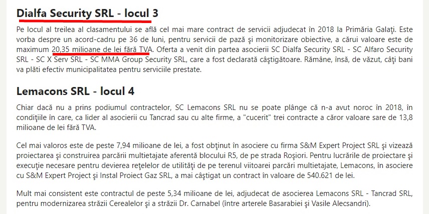 “Pe locul al treilea al clasamentului se află cel mai mare contract de servicii adjudecat în 2018 la Primăria Galaţi. Este vorba despre un acord-cadru pe 36 de luni, pentru servicii de pază şi monitorizare obiective, a cărui valoare este de maximum 20,35 milioane de lei fără TVA. Oferta a venit din partea asocierii SC Dialfa Security SRL – SC Alfaro Security SRL – SC X Serv SRL – SC MMA Group Security SRL, care a fost declarată câştigătoare. Rămâne, însă, de văzut, câţi bani va plăti efectiv municipalitatea pentru serviciile prestate”,