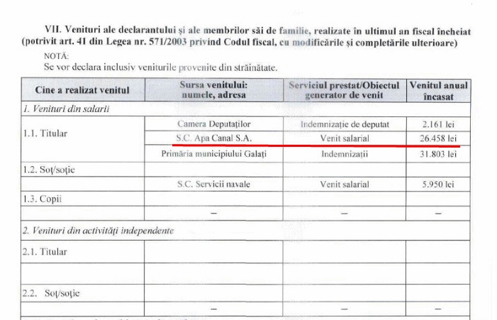 În declarația de avere depusă la începutul mandatului de deputat, Florin Popa a precizat că, în 2016, a încasat suma de 26.458 de lei, de la Apă Canal Galați (vezi foto mai jos).