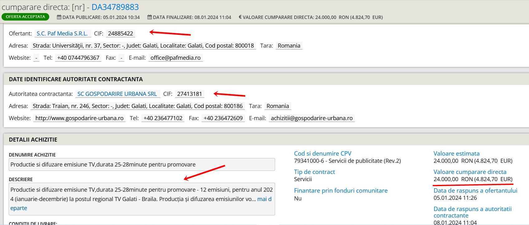 Contractul dintre Gospodărire Urbană SRL Galați și PAF Media SRL (firma care se află în spatele TV Galați și care aparține familiei fostului deputat PSD Galați, Florin Pâslaru) a fost parafat pe 5 ianuarie 2024, ora 11.26, la mai puțin de o oră de când fusese lansat pe SEAP, ora 10.34 (vezi foto mai jos). Este vorba despre o achiziție directă, adică cu dedicație, pe înțelesul tuturor.