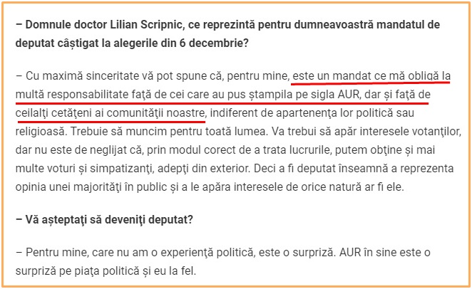 Într-un interviu acordat cotidianului Viața Liberă, citat de PressHub (vezi foto mai jos), deputatul AUR Galați Lilian Scripnic spunea că mandatul de parlamentar îl obligă la multă responsabilitate față de toți membrii comunității și că este conștient că trebuie să apere interesele majorității.