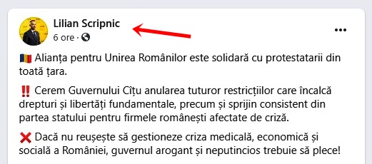 Deputatul Alianța pentru Unirea Românilor (AUR) Galați, Lilian Scripnic, încearcă să obțină capital electoral de pe urma protestelor anti-mască, declarându-se solidar cu cei care au încălcat toate regulile sanitare, în cele 3 zile de manifestații.