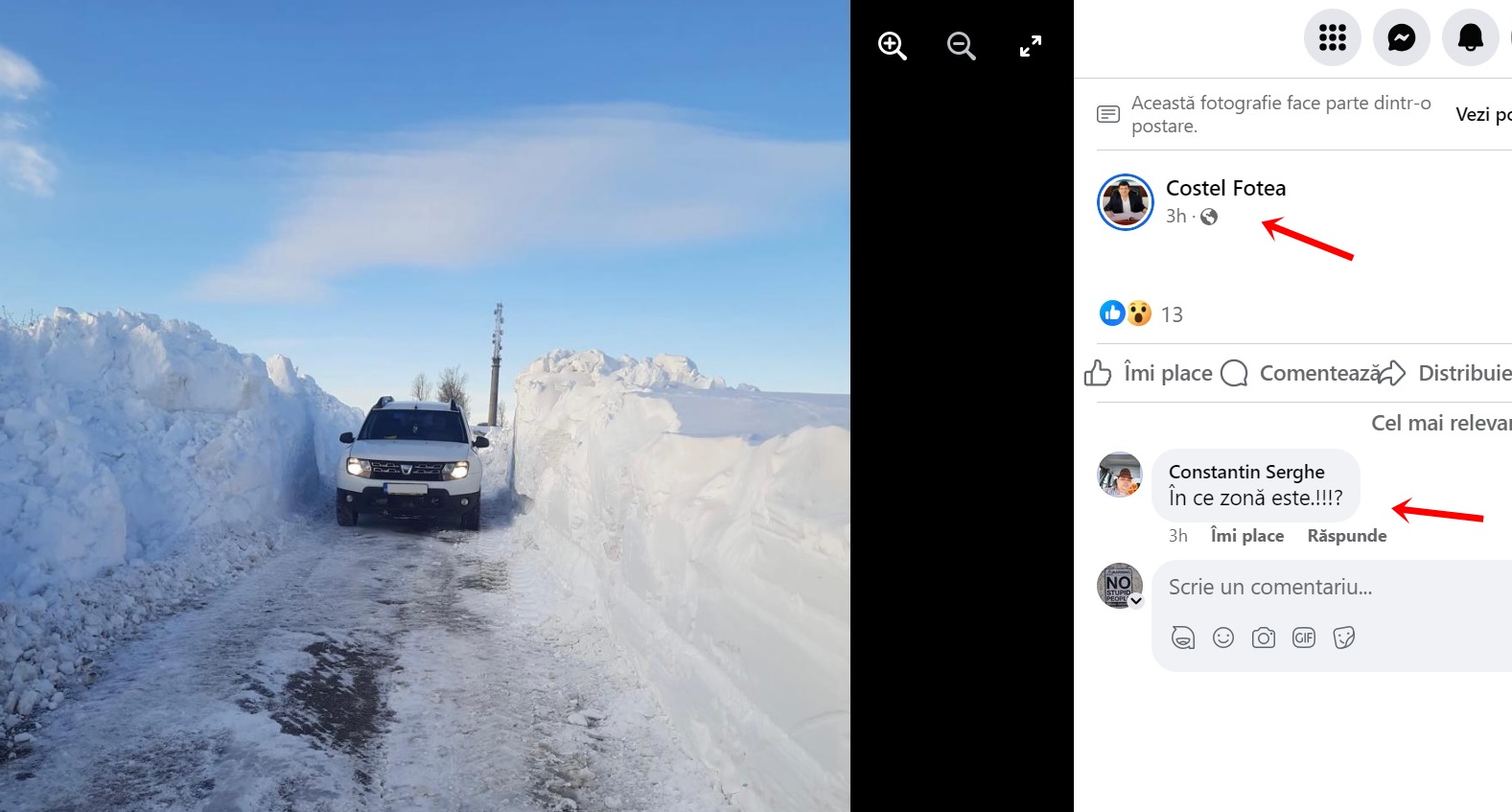 Un utilizator pe nume Constantin Serghe a comentat (vezi foto mai jos) la postarea președintelui Fotea, întrebându-l în ce zonă anume a fost făcută poza cu Dusterul lângă acei nămeți de 2 metri, căci el nu știa să fi fost atâta zăpadă pe vreun drum din județ.