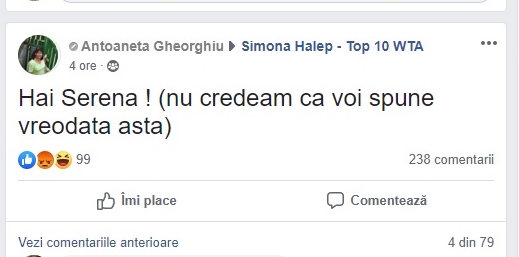 “Hai Serena! Nu credeam că voi spune vreodată asta”, a scris o fană a Simonei Halep (vezi foto sus).
