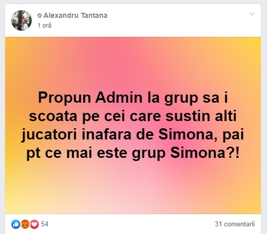 Altcineva a propus, pe un grup al susținătorilor Simonei Halep, ca administratorul grupului să îi elimine pe cei care susțin altă jucătoare în afară de Simona Halep, cu trimitere clară la Bianca Andreescu, care fusese încurajată anterior de câțiva membri ai grupului, membri care, auzi blasfemie!, apoi au îndrăznit să îi ureze succes sâmbătă seară Biancăi (vezi foto mai jos).