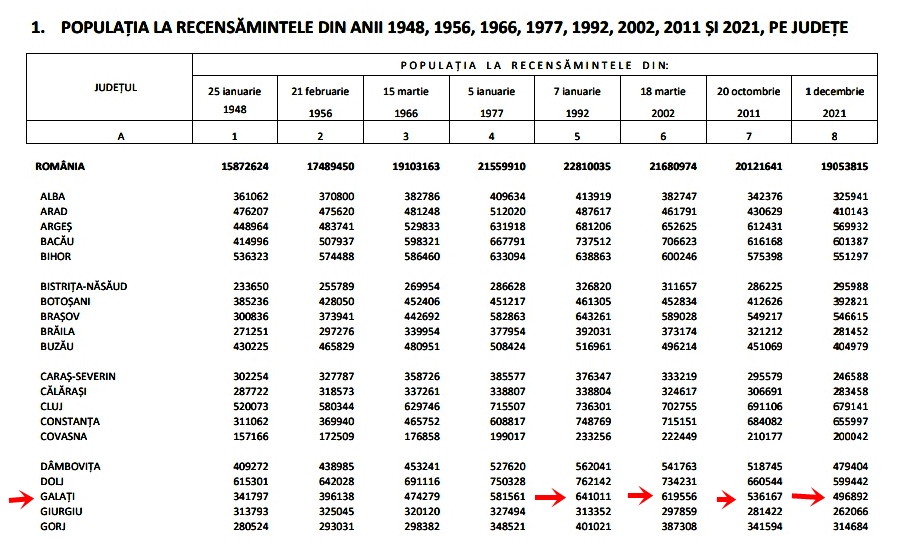 În anul 2022, potrivit datelor oficiale, județul Galați mai numără numai 496.892 de cetățeni, cu 114.119 mai puțini decât acum 30 de ani (anul 1992) – vezi foto mai jos.