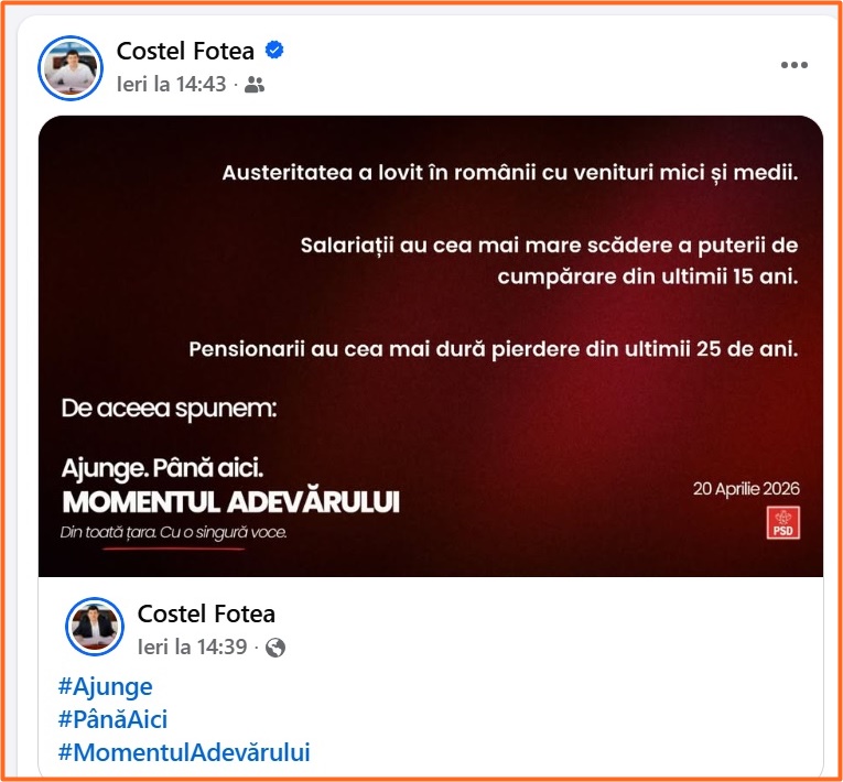 Fraților, Pucheanu si Fotea – doi PSD-iști care nu au zis nici pâs atunci cand șeful lor, Marcel Ciolacu, băga țara în gard – anunță de vreo 3 zile încoace că vor să îi salveze pe gălățeni de sărăcia în care i-a aruncat Guvernul Bolojan.