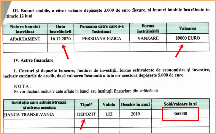 Și nu doar că a reușit să achite suma de 47.500 de euro dintr-un împrumut bancar, dar a putut să pună deoparte și 360.000 de lei (75.000 de euro) la bancă… toate din vânzarea unui apartament-fantomă situat pe str. Tecuci, pe care, conform veniturilor sale legale, nu ar avea cum să îl justifice.