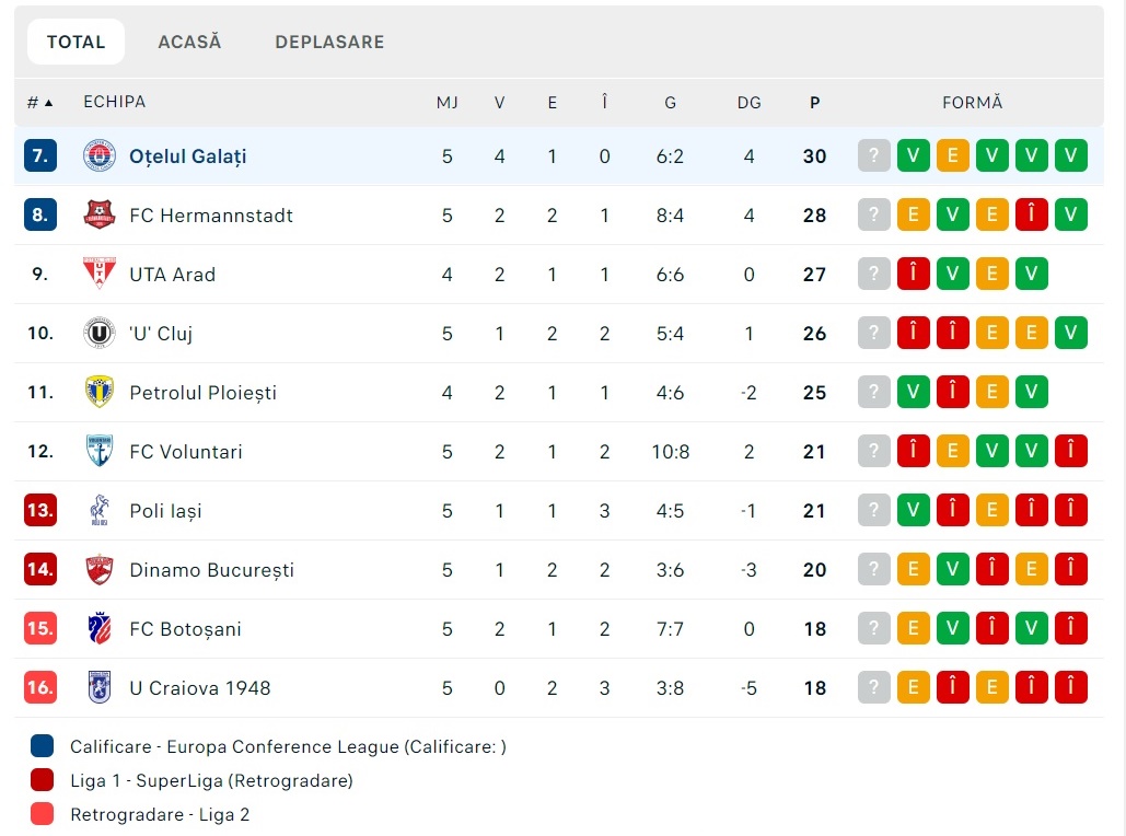 Oțelul Galați a ajuns acum pe locul 1 în play-out (grupa de retrogradare), cu 30 de puncte, având cu 9 puncte mai mult decât prima echipă care va merge la baraj (Poli Iași, în acest moment).