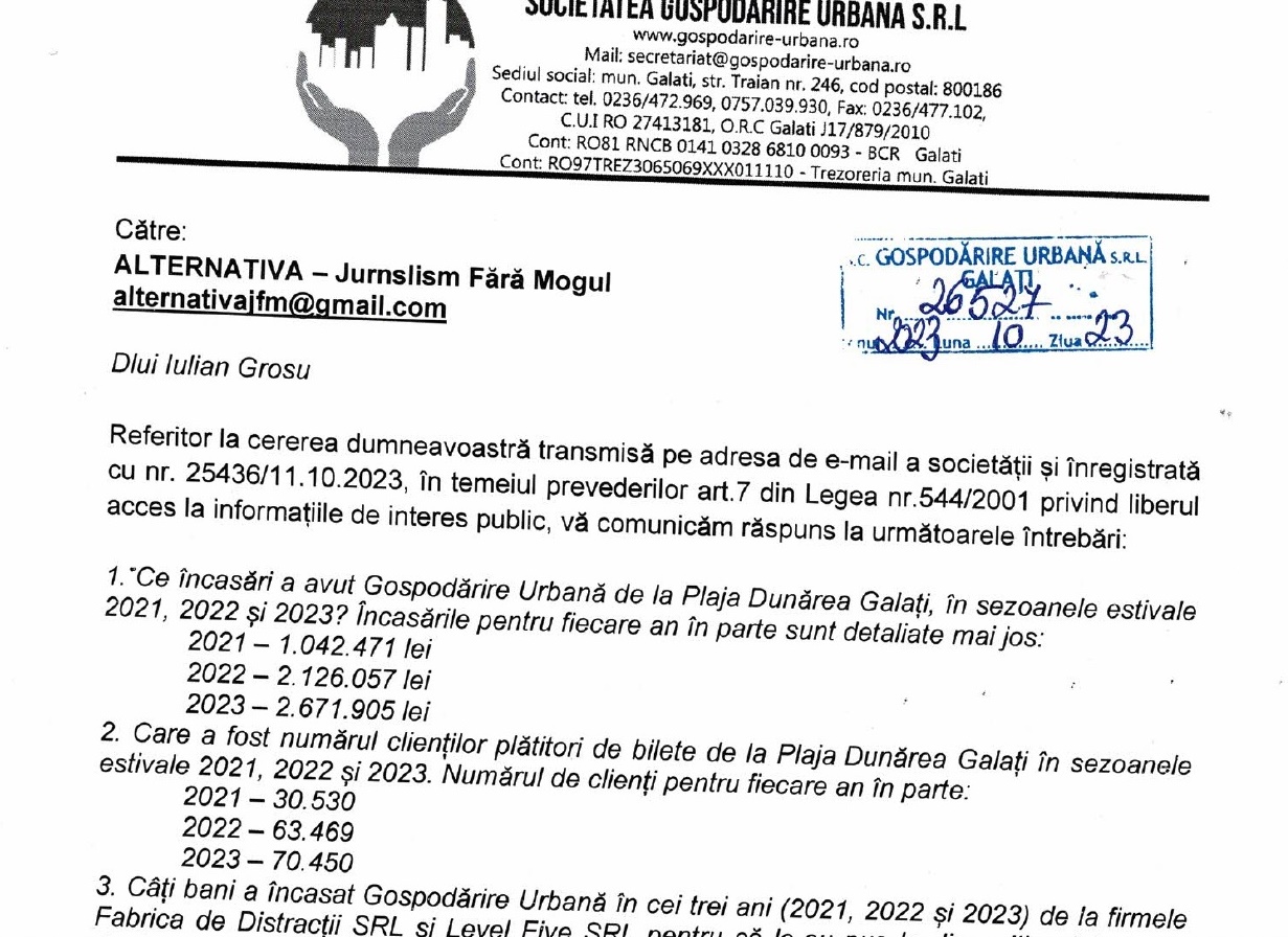 1. Ce încasări a avut Gospodărire Urbană SRL de la Plaja Dunărea Galați, în sezoanele estivale 2021, 2022 și 2023? Avem rugămintea să precizați suma încasată pentru fiecare an în parte.