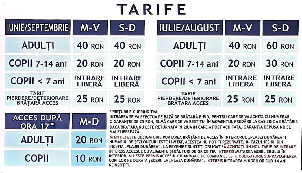 Tarifele de la Plaja Dunărea, în vara lui 2023