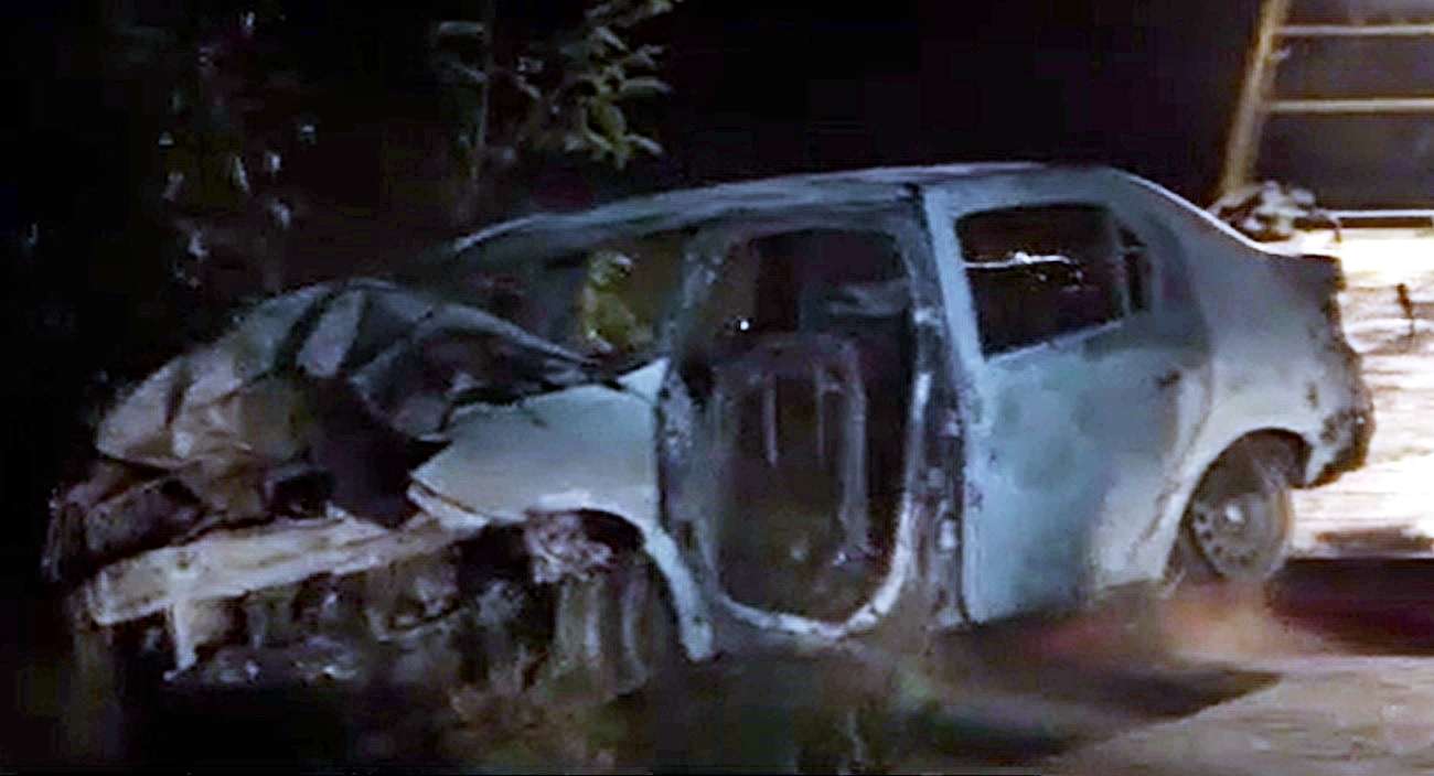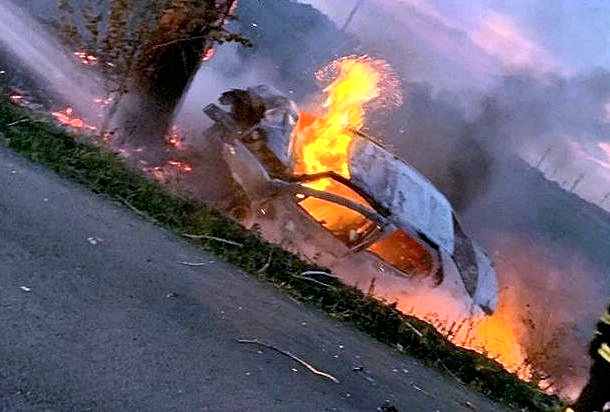 Așadar, șocul izbirii de arborele de pe marginea șoselei nu a fost suficient de puternic încât să-i lase pe cei doi polițiști inconștienți, dar sistemele de siguranță au funcționat suficient de prost încât combustibilul, scăpat din rezervor, să se împrăștie prin tot autovehiculul producând un incendiu rapid, nimicitor.