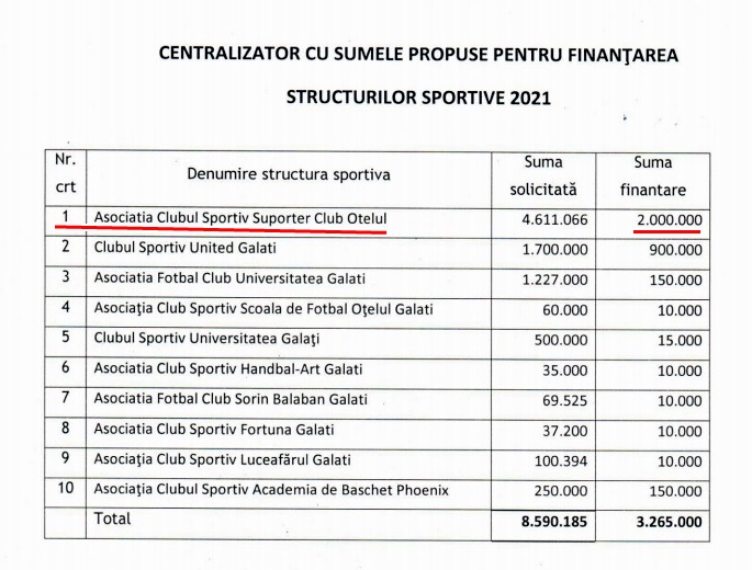 În total, Primăria Galați va aloca în 2021 suma de 3.265.000 de lei unui număr de 10 asociații/cluburi (vezi tabelul de mai sus).