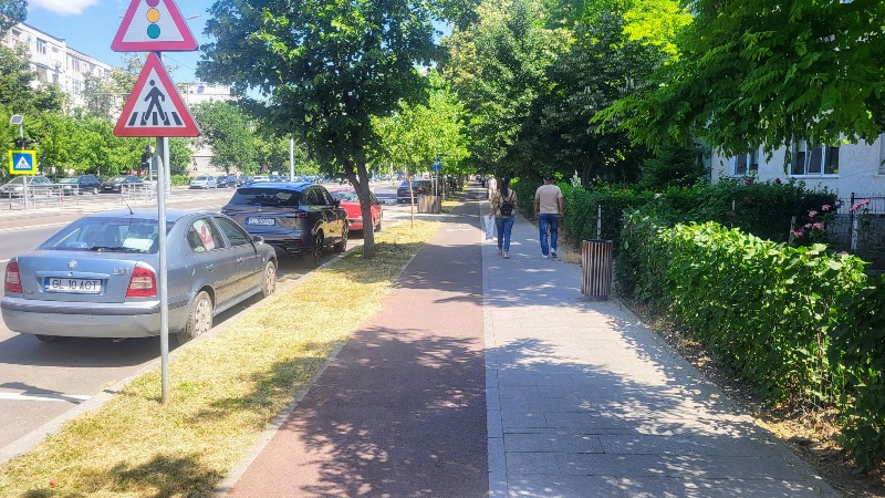 Așa s-a ajuns ca un trotuar lat de 2,5 metri să fie împărțit în două: o parte pentru pietoni și una pentru bicicliști (vezi foto deschidere).