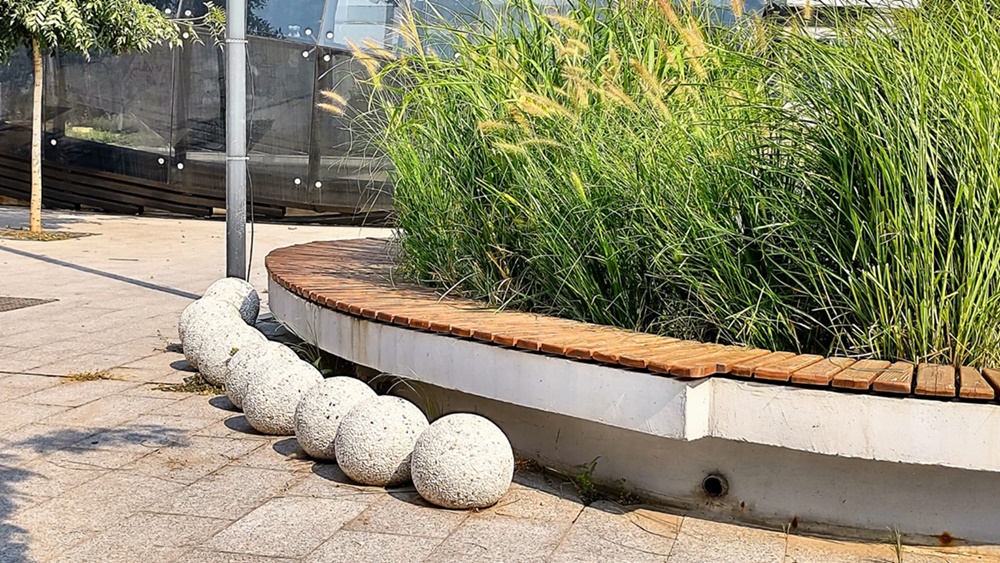 Pur și simplu, nu are nicio logică amplasarea acelor bile din beton în jurul băncii.