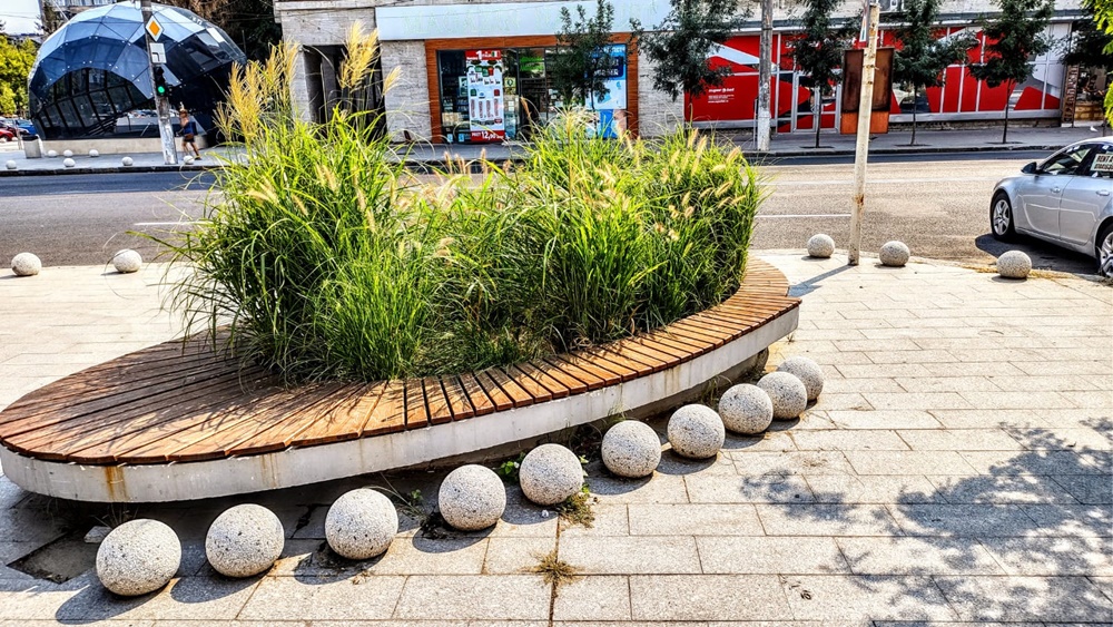 De ce ar pune cineva bile din beton (care, apropo, costă aproximativ 300 de lei bucata) în jurul unei bănci unde se presupune că oamenii vin să se relaxeze?