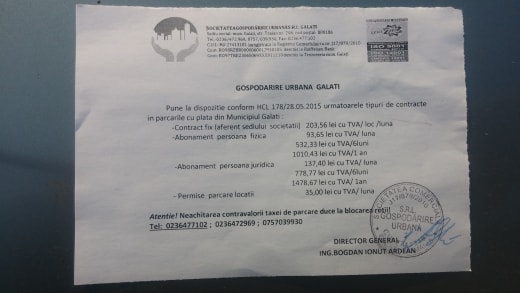O parcare care deservea 6 blocuri situate pe str. Traian colț cu Basarabiei (unde e sediul Electrica, lângă Baia Comunală) a fost transformată peste noapte în parcare cu plată de către Primăria Galați, via Gospodărire Urbană SRL. Taxa este 1,5/oră. Iar taxa de deblocare în cazul în care nu scoți tichet de la parcometru este de 200 de lei.