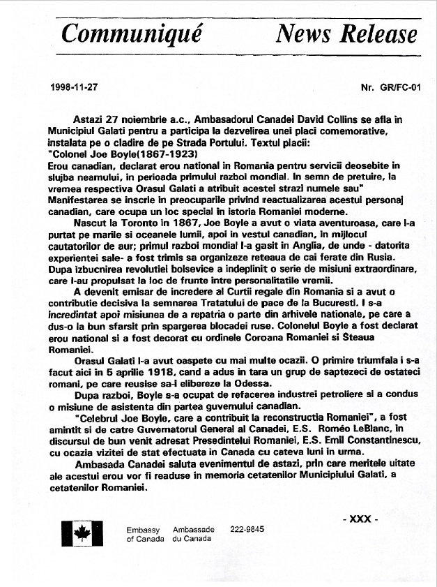 - b) în 27.11.1998, aceeaşi ambasadă a Canadei evidenţiază scopul acţiunii ca fiind acela „ca meritele uitate ale acestui erou să fie readuse în memoria poporului român” atunci, după 8 decenii. Iată însă că, acum, poporul român îşi amintește de meritele colonelului Boyle și după un secol, nu însă şi de evenimentele de acum două decenii şi de placa dispărută… acum doar 12 ani (!!)