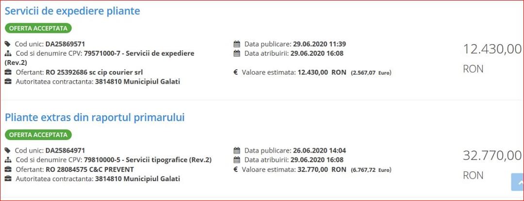 Este vorba despre un contract de un serviciu de tipărire “pliante din raportul primarului”, în valoare de 32.770 de lei, și un alt contract de “servicii de expediere pliante”, în valoare de 12.430 de lei (vezi foto mai jos).