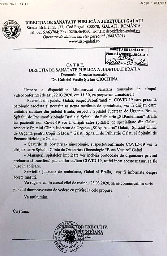 Conform documentului urmează ca, „pacienții din județul Galați, suspecți/confirmați cu COVID-19, care prezintă patologie asociată și necesită asistență medicală de specialitate”, să fie internați în spitalele din municipiul Brăila, respectiv Spitalul Județean de Urgență, Spitalul de Pneumoftiziologie și Spitalul de Psihiatrie „Sf. Pantelimon”.