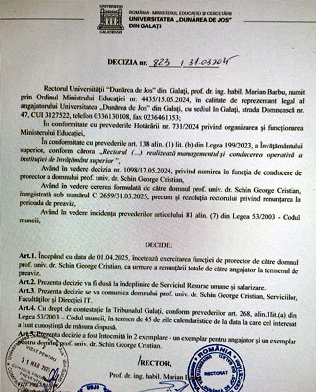 Contactat telefonic de Alternativa – Jurnalism fără mogul, prorectorul George Schin, a cărui activitate va înceta de mâine, 1 aprilie 2025, nu a dorit să dezvolte subiectul demisiei sale neașteptate.