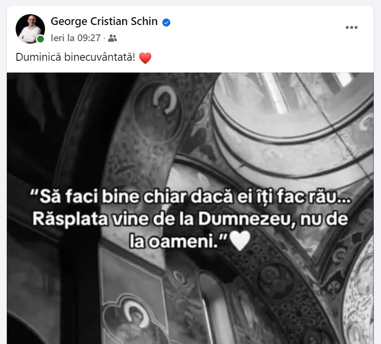 De altfel, cea mai recentă postare a lui George Schin pe contul său de Facebook, făcută ieri, duminică, 30 martie 2025, pare să fie un mesaj pentru cei care l-au lucrat, care i-au făcut rău.