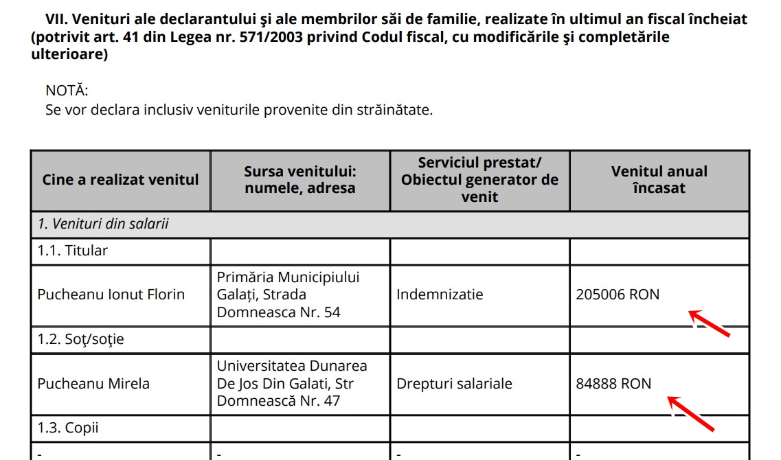 Iar soția primarului Pucheanu, Mirela Pucheanu (fostă Balaban), care e clar că nu putea fi decât bugetară – că doar nu o să își lase ditamai primarul soția să muncească în mediul privat – a avut un venit anual de 84.888 de lei (adică 7.074 de lei net/lună) de la Universitatea Dunărea de Jos din Galați, acolo unde se face că plimbă două hârtii de colo-colo.