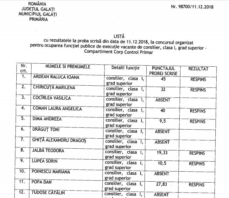 O veste a picat ca un trăsnet, miercuri, pe holurile Primăriei Galați și a făcut să cadă varul de pe pereții instituției. Favorita nr. 1 a concursului de accedere în Corpul de Control al Primarului Pucheanu, este vorba despre d-na Raluca Ardean, nu a promovat examenul, deși a luat cea mai mare notă dintre toți cei 7 candidați prezenți la proba scrisă.