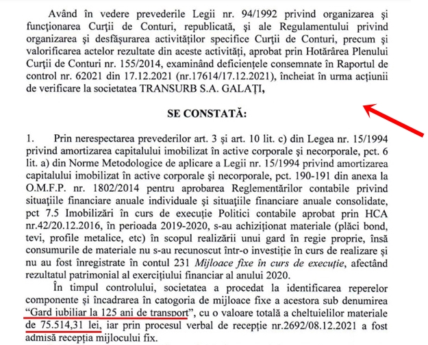 “În timpul controlului, societatea a procedat la identificarea reperelor componente și încadrarea în categoria de mijloace fixe a acestor sub denumirea de Gard jubiliar la 125 de ani de transport, cu o valoare totală a cheltuielilor materiale de 75.514,13 lei”,
