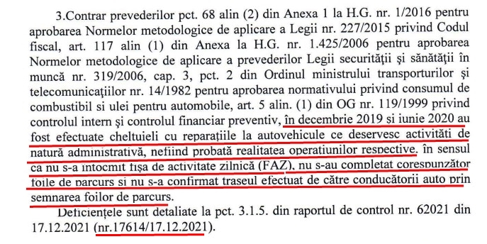“În decembrie 2019 și iunie 2020, au fost efectuate cheltuieli cu reparațiile la autovehicule ce deservesc activități de natură administrativă, nefiind probată realitatea operațiunilor respective, în sensul că nu s-a întocmit fișa de activitate zilnică (FAZ), nu s-au completat corespunzător foile de parcurs și nu s-a confirmat traseul efectuat de către conducătorii auto prin semnarea foilor de parcurs. Deficiențele sunt detaliate la pct. 3.1.5 din raportul de control nr. 62021 din 17.12.2021″,