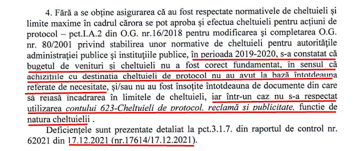 “În perioada 2019-2020, s-a constatat că bugetul de venituri și cheltuieli nu a fost corect fundamentat, în sensul că achizițiile cu destinația cheltuieli de protocol nu au avut la bază întotdeauna referate de necesitate și/sau nu au fost însoțite întotdeauna de documente din care să reiasă încadrarea în limitele de cheltuieli, iar într-un caz nu s-a respectat utilizarea contului 623 – Cheltuieli de protocol, reclamă și publicitate, funcție de natura cheltuielii. Deficiențele sunt prezentate detaliat la pct. 3.1.7. din raportul de control nr. 62021 din data de 17.12.2021″,